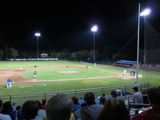 After returning from an afternoon on the beach, I settled into watching The Red Sox hammering the Astros back in Houston’s Minute Maid Park. Ironic, eh? But, a sound outside lured me out on to the deck: the clap of a bat and sound of applause that could only be a baseball game. The glow of outfield lights above the treetops behind our hotel confirmed my suspicion: it had to be a Cape Cod League game.