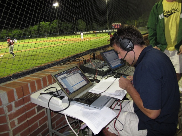 I strapped on my Tevas, grabbed the camera and followed the sound and lights to find the Hyannis Harbor Hawks in the top of the 8th inning against the Wareham Gatemen. The 9-5 score told me the game was pretty much in the bag for Hyannis. The play-by-play announcer, pictured here doing the Internet broadcast, pretty much confirmed that conclusion. But, in baseball as in life, it’s not over till it’s over. So, I stayed for the remaining inning-and-a-half.