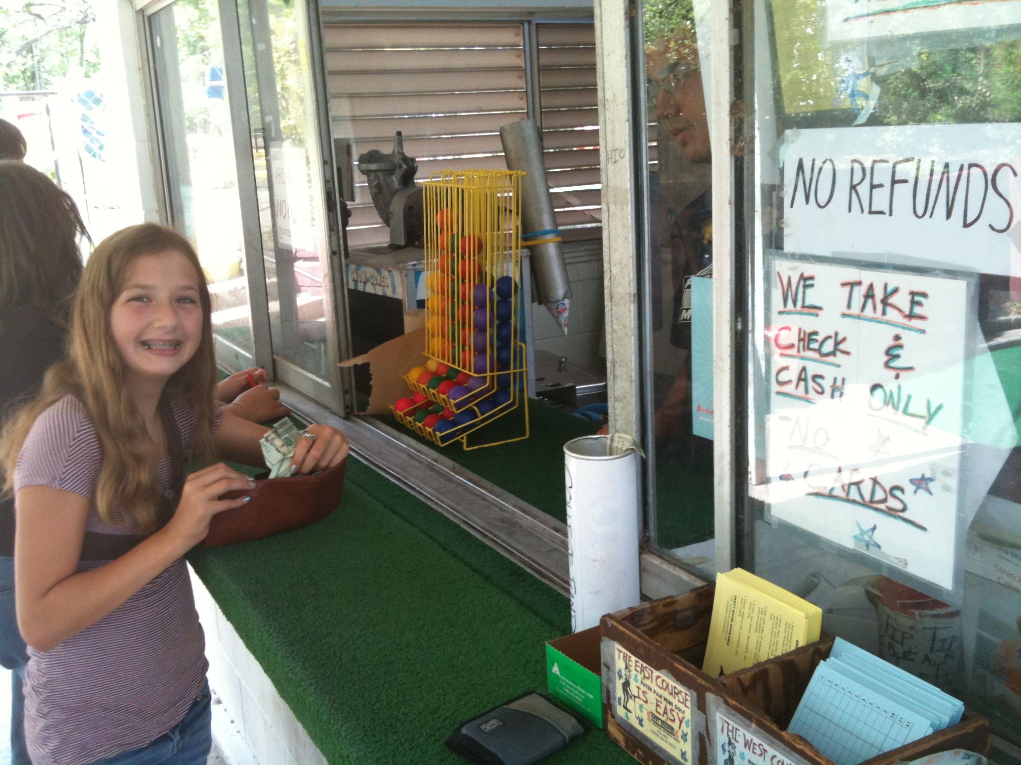 It was also a cash-only operation. Go figure. Guess who didn’t have a single dollar remaining in his billfold? You don’t have to guess which of my kids was able to whip out cash to pay for us to play–and did so gladly. Stella is not only the one of my kids who could one day take over my business, but probably do better with it than me. (She made no big deal of her ability to help, or my need for it. How cool is that? She did, however, mention something about interest on the loan.)